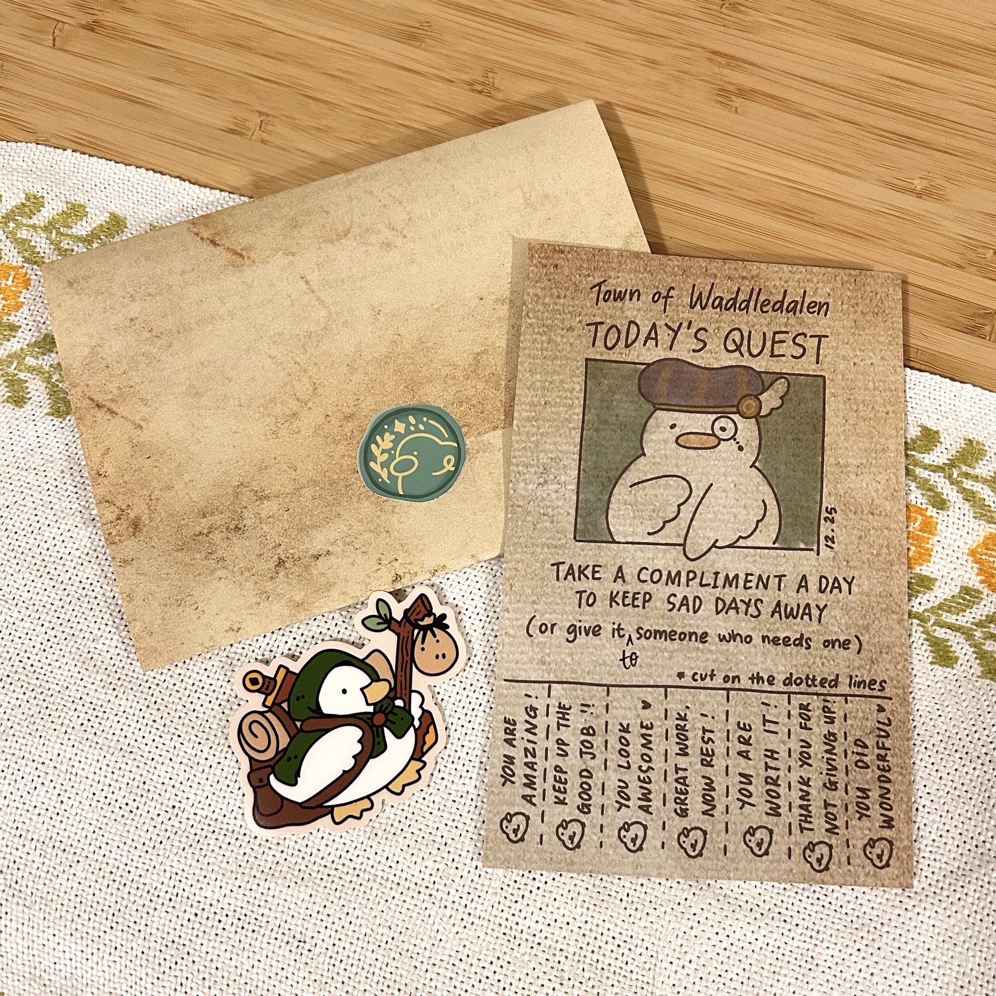 ✦ A surprise printed item (somewaddle might want to slip you something from the town's quest board. Let's hope it'll pass Waddledalen's postal inspection)